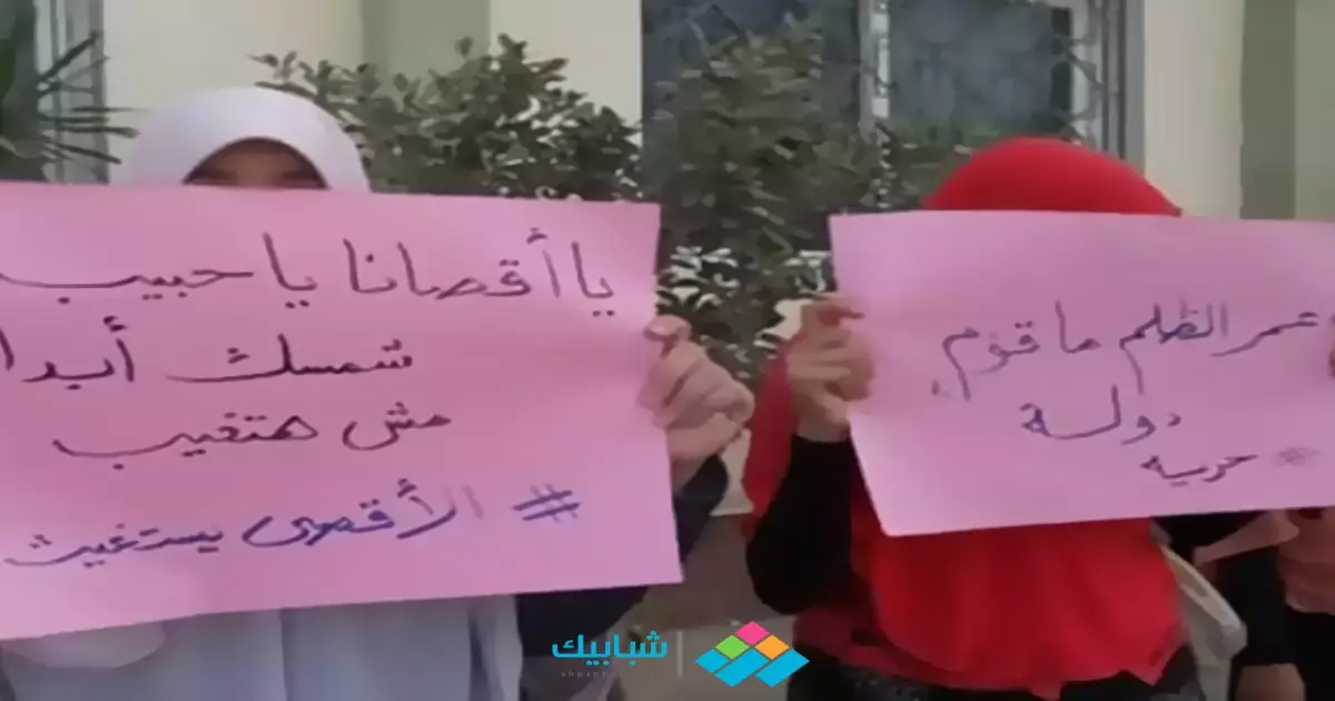 ورفعت الطالبات لافتات مكتوب عليها « يا أقصانا يا حبيب شمسك أبدا ما هتغيب، الأقصى يستغيث ، عمر الظلم ما قوم دولة ».