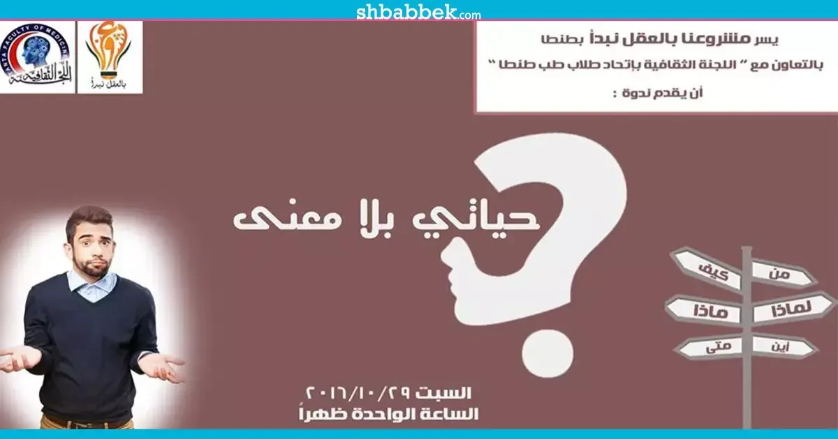 ينظم فريق «بالعقل نبدأ» بالتعاون مع اتحاد كلية الطب بجامعة طنطا ندوة بعنوان «حياتي بلا معني» بقاعة "ابن سينا" بالكلية، السبت المقبل.