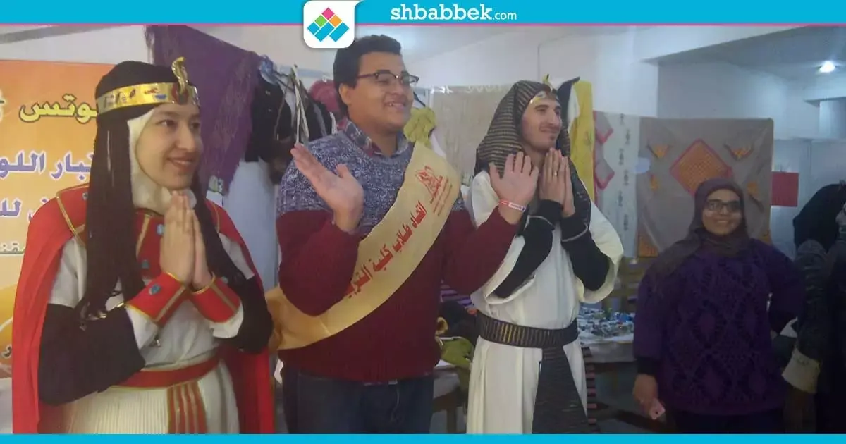 يستقبل طالب وطالبة بكلية التربية جامعة حلوان ضيوف المعرض الفني الذي تنظمه الكلية بمناسبة اليوم العالمي لذوي الاحتياجات الخاصة، بارتداء زي خوفو ونفرتيتي.