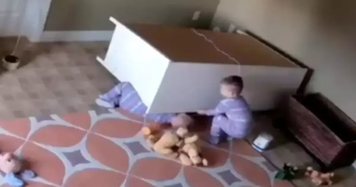 شاهد| طفل ينقذ توأمه من الموت بعد سقوط «دولاب» الملابس عليه