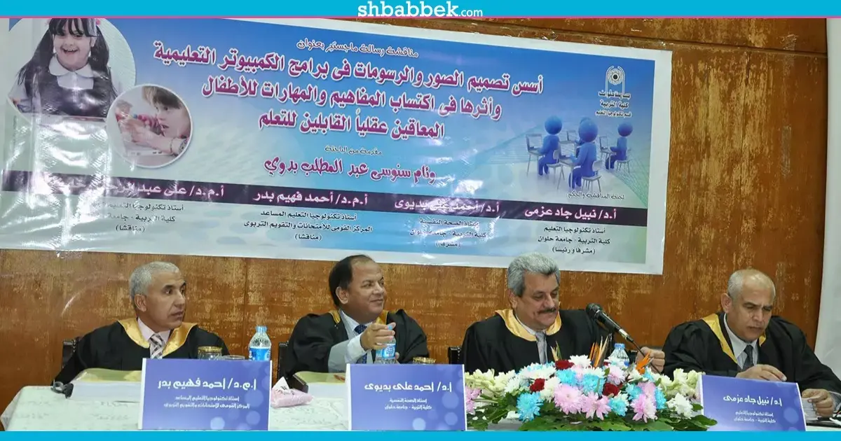 ناقشت الباحثة بكلية التربية جامعة حلوان، قسم تكنولوجيا التعليم، وئام سنوسي عبد المطلب، رسالة ماجستير بعنوان «أسس تصميم الصور والرسومات فى برامج الكمبيوتر التعليمية، وأثرها فى إكتساب المفاهيم والمهارات للأطفال المعاقين عقليًا القابلين للتعلم».