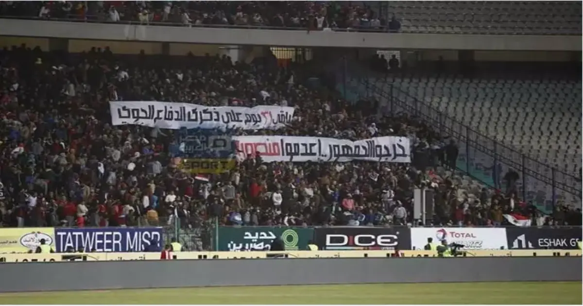 ورفعت بعض الجماهير لافتة مكتوب عليها: "باقي 31 يوم على ذكرى مجزرة الدفاع الجوي أعدموا مرتضى منصور"، مرددين هتافات :"شمال يمين خرجوا المحبوسين".