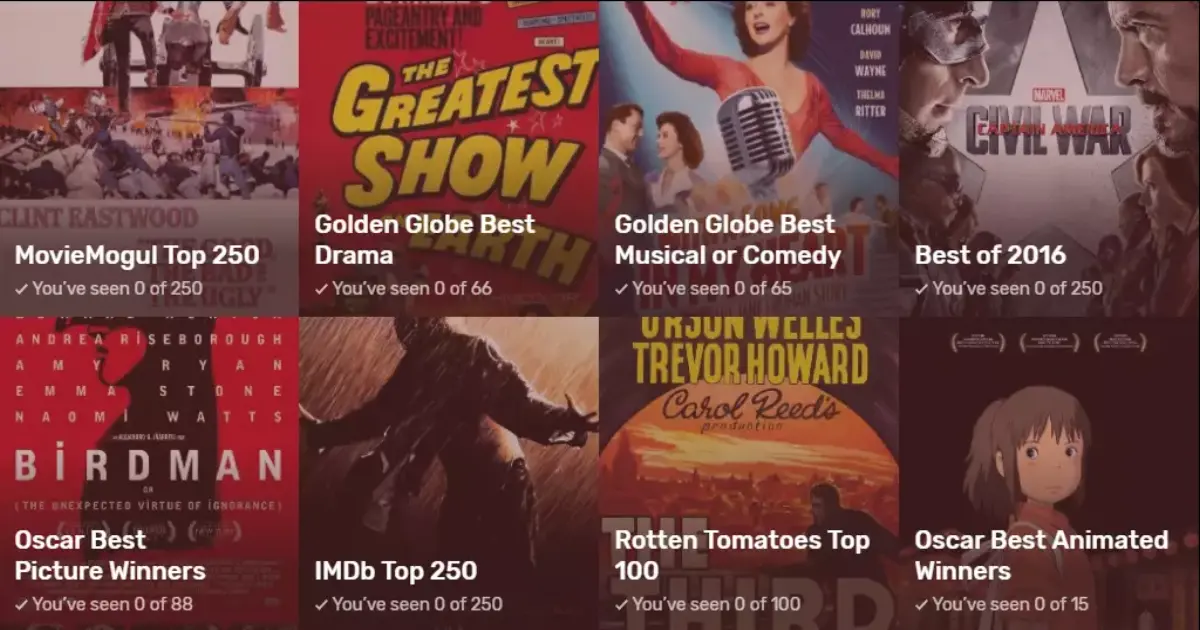 ويوفر الموقع أغلب القوائم السينمائية الشهيرة مثل قائمة موقع "IMDB" لأفضل 250 فيلم في التاريخ وقائمة أفضل 100 فيلم على موقع الطماطم الفاسدة إلى جانب قوائم خاصة به.