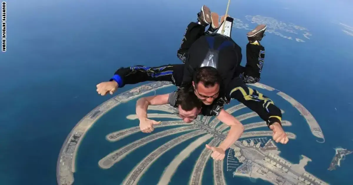 تجربة الهبوط بالمظلات في نادي "سكاي دايف دبي"، والاستماع بمشاهدة نخلة جميرا من أعلى، ويتم القفز من على ارتفاع أكثر من 3900 متراً.