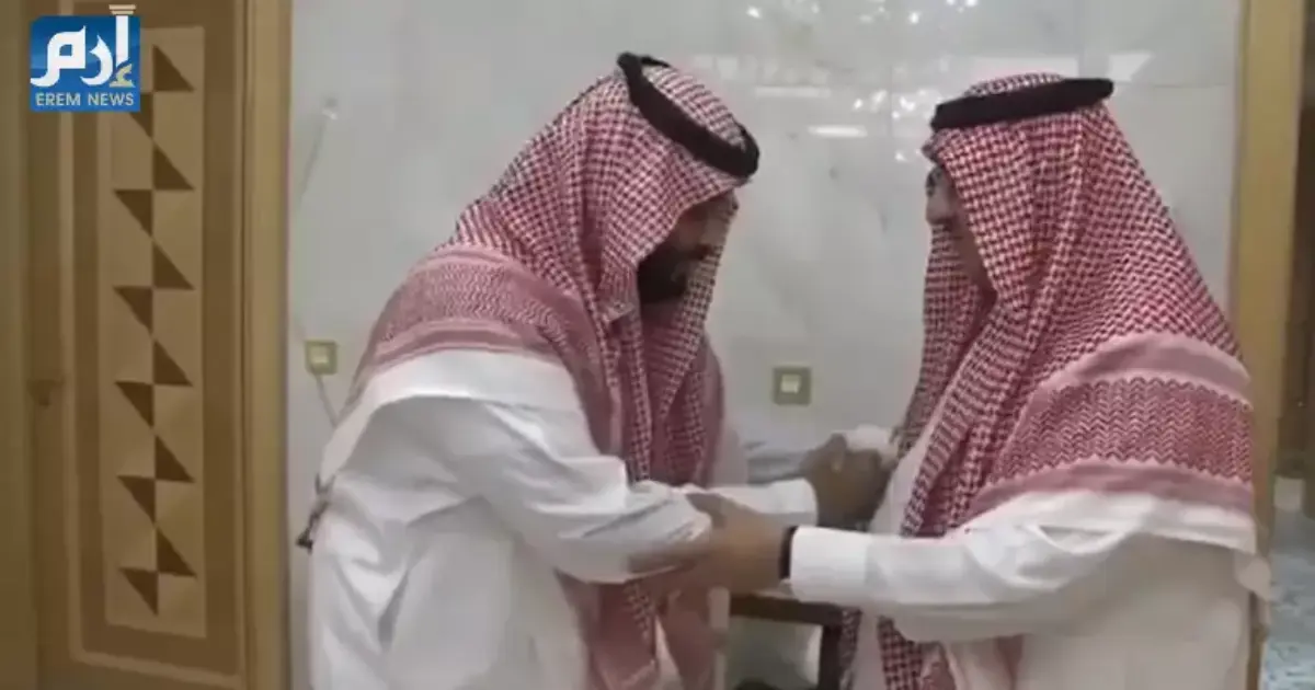 وظهر في مقطع الفيديو قيام محمد بن سلمان بتقبيل يد وركبة محمد بن نايف، وقام الأخير بالدعاء له بالتوفيق في هذه المهم.