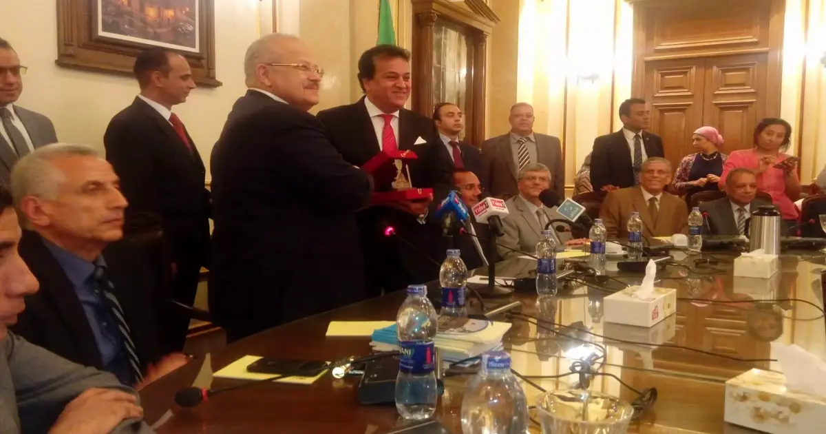 أهدى رئيس جامعة القاهرة محمد عثمان الخشت، درع الخريجين لوزير التعليم العالي «لما لديه من قدرة في التأثير على المجتمع المحيط به».