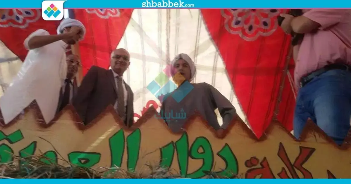 وتميزت كلية التربية عن غيرها من الكليات بدوار العمدة المصنوع من الخشب والخوص، وزينوا جدرانه باللوحات الفنية والكاريكاتير للطالب بالفرقة الأولى رامي العربي وغيره من الطلاب الموهوبين.
