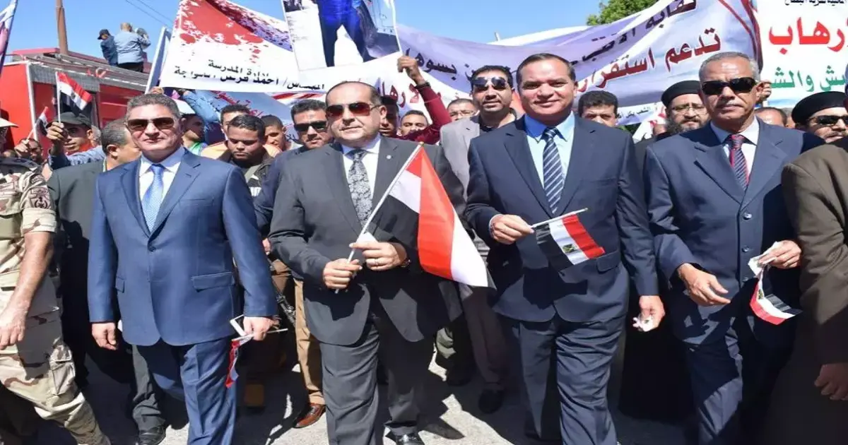 وانطلقت المسيرة من أمام الحرم الجامعي القديم حتى مديرية الأمن وشارك فيها ممثلين عن جميع طوائف المجتمع المدني والجهات الحكومية منها الأزهر والكنيسة، والمدارس الخاصة والحكومية، والمجلس القومي لذوي الإعاقة، والوحدات المحلية، والمديريات التعليمية، والأحزاب السياسية والقوى الشعبية، والمجلس القومي للمرأة، والأوقاف، والاتحاد الدولي للمرأة، وطلاب من أجل مصر.