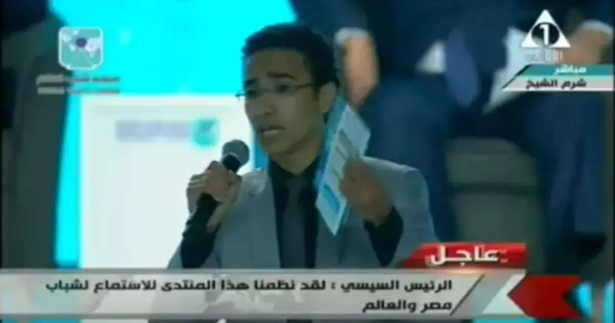 وبعد حديث الرئيس، اعتذر الشاب ورحب بالمشاركين في منتدى شباب العالم، ثم عرف نفسه بأنه عالم مصري ويعمل منذ 3 سنوات على مرض الفشل الكلوي، ونتج ذلك عن عمل كلى صناعية يمكن زراعتها في جسم الإنسان، لكي لا يكون هناك فشل كلوي، خاصة أن والده توفي منذ 3 سنوات بهذا المرض، ما دفعه لأخذه عدوًا له.