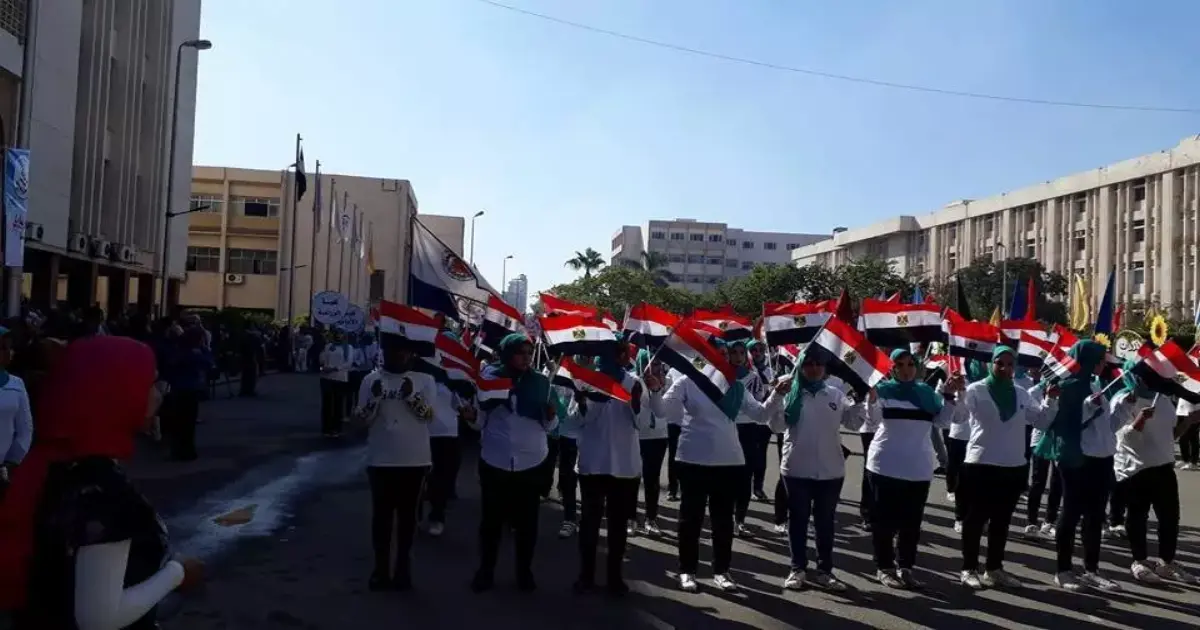 بدأ الاحتفال بطابور عرض يتقدمه حاملي الأعلام شاركت فيه كليات الجامعة، وحمل الطلاب لافتتات توضح الأنشطة التي سيتم تنفيذها خلال المهرجان، ثم شارك جميع الحضور في تحية العلم.