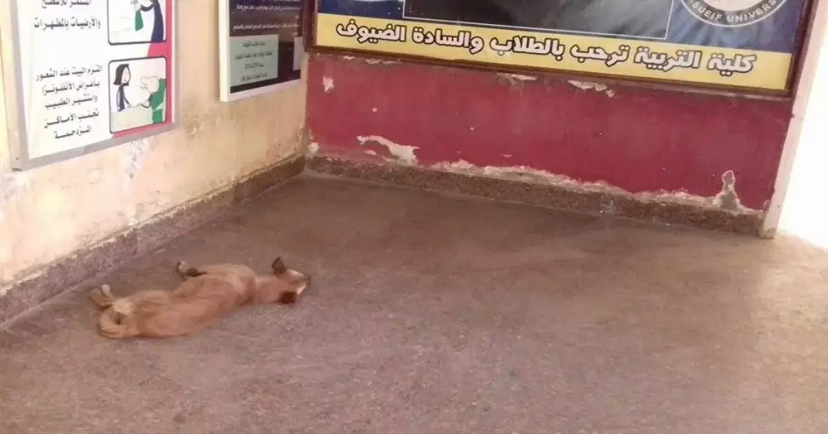 وأظهرت الصور افتراش عدد من الكلاب لمدخل الكلية وانتشار القطط على السلالم الخاصة بها.