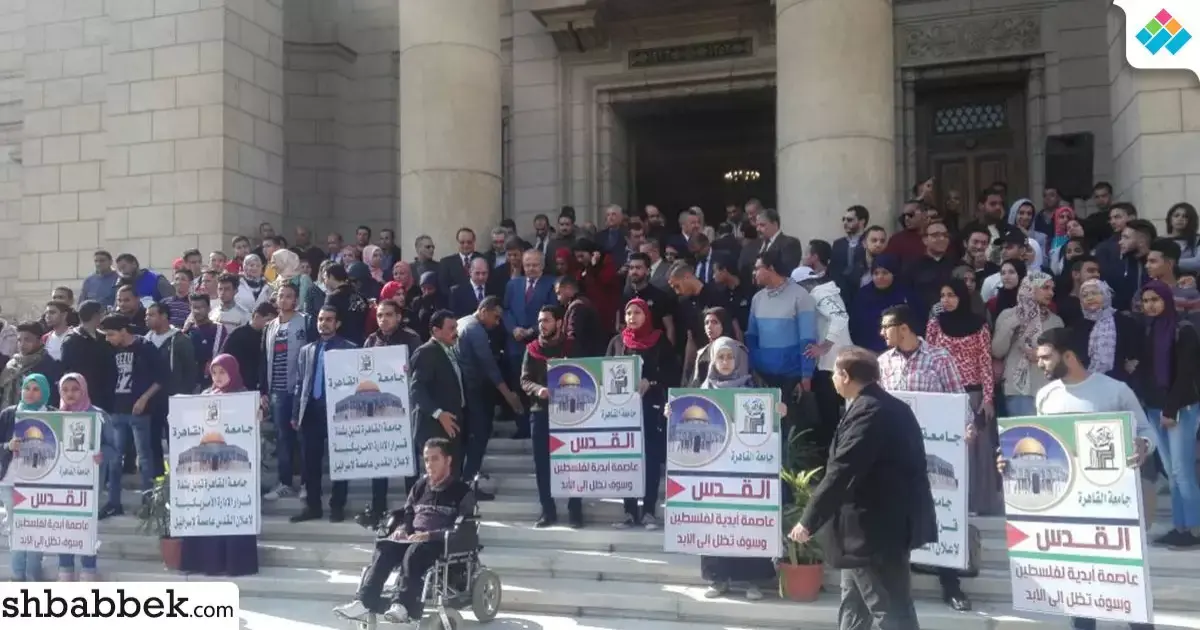نظمت جامعة القاهرة، اليوم الأحد وقفة احتجاجية لرفض قرار الرئيس الأمريكي، دونالد ترامب، بنقل سفارة بلاده إلى القدس العربية.