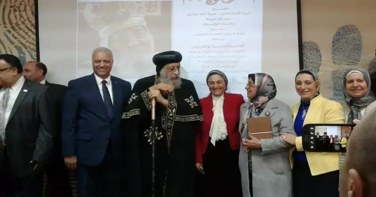 وأهدى البابا تاوضروس لرئيس الجامعة وزملاء دفعته وعميدة الكلية لوحات من عمل الراهبات وأيقونة العائلة المقدسة فى صورة كتاب عليه علم مصر.