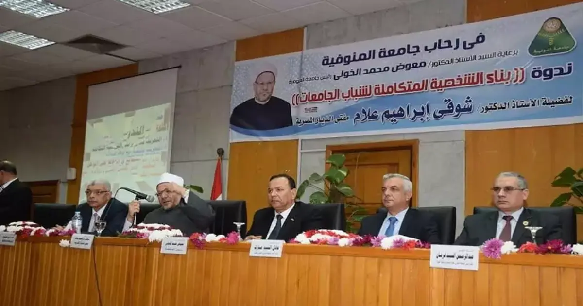 نظمت جامعة المنوفية، اليوم الأحد، ندوة تثقيفية وتوعوية تحت عنوان «بناء الشخصية المتكاملة لشباب الجامعة»، حاضر فيها مفتي الجمهورية الدكتور شوقي علام.