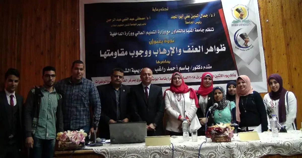 نظم اتحاد طلاب جامعة المنيا بالتعاون مع وزارتي التعليم العالي والداخلية ندوة بعنوان (ظواهر العنف والإرهاب ووجوب مقاومتها)، بهدف رفع وعي الطلاب لمناهضة ثقافة العنف والإرهاب.