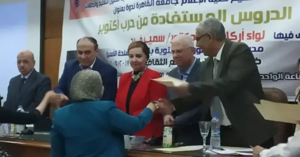 أقامت كلية الإعلام جامعة القاهرة، اليوم الأربعاء، ندوة عن انتصارات حرب أكتوبر في قاعة المؤتمرات بالكلية، بحضور عميدة الكلية، الدكتور هبة السمري، والخبير العسكري، اللواء سمير فرج.