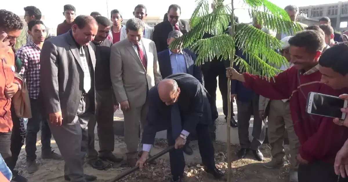 زرع رئيس جامعة المنيا، الدكتور مصطفى عبد النبي، ونائبه، الدكتور محمد جلال حسن، شجرة بمدخل بوابة الجامعة الغربية.
