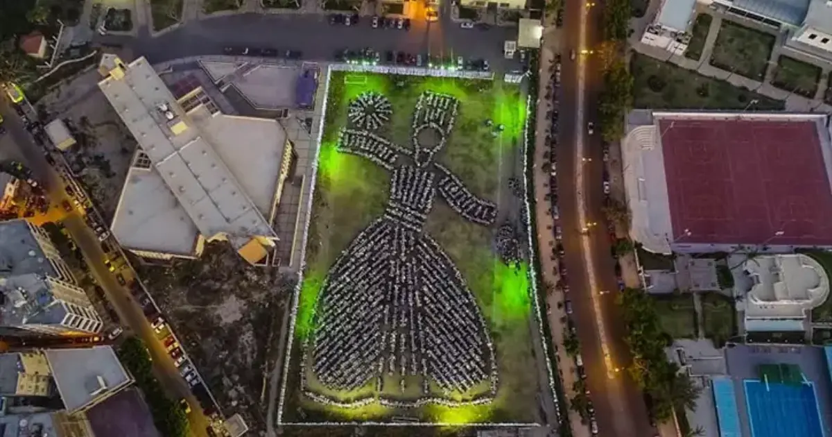وأعد طلاب الكلية والقائمون على تنظيم الإفطار الجماعي ملعب الجامعة ليكون على شكل راقص التنورة بجلبابه الفضفاض وحزام الوسط وطاقيته الصوف.