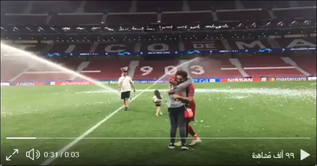 محمد صلاح يعانق زوجته في ملعب الفوز بكأس أبطال أوروبا (فيديو)
