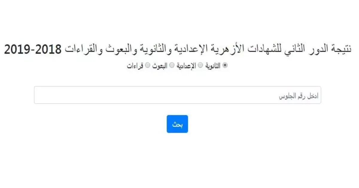 وتجدون في هذا التقرير رابط للاستعلام عن نتيجة امتحانات الثانوية الأزهرية للعام الدراسي 2018/2019 (الدور الثاني) بالإضافة إلى نافذة بالأسفل يُمكن للطلاب من خلالها معرفة النتيجة.