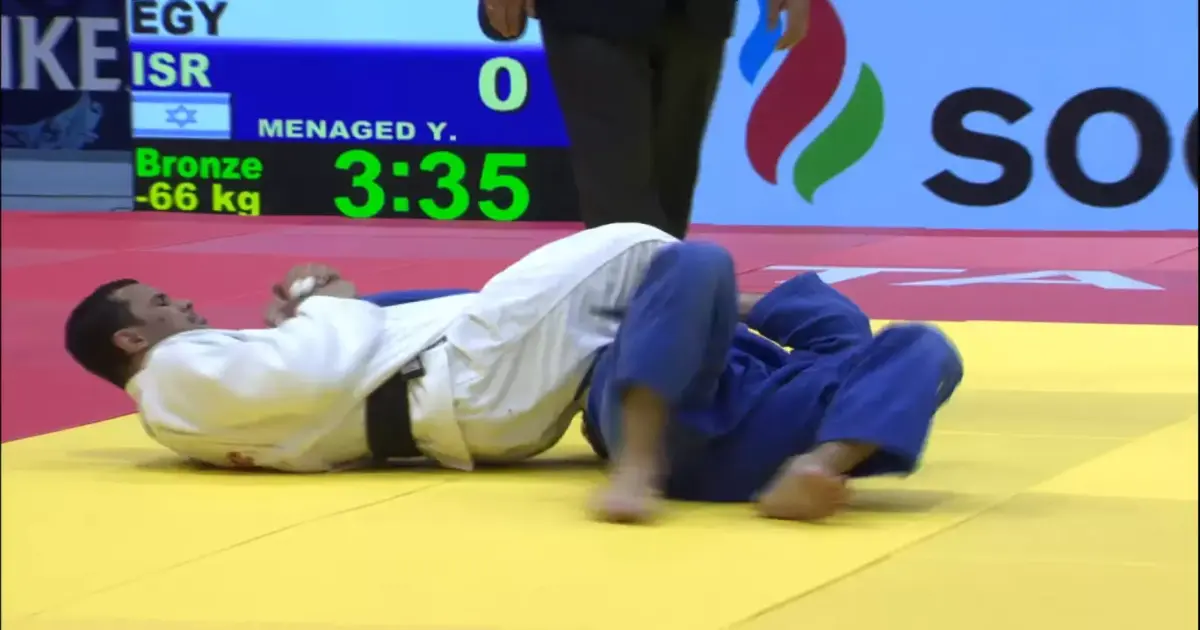 وقام بطل مصر محمد عبد الموجود بعمل حركة الإيبون على لاعب دولة الاحتلا الاسرائيلي وسحقه في 30 ثانية فقط.