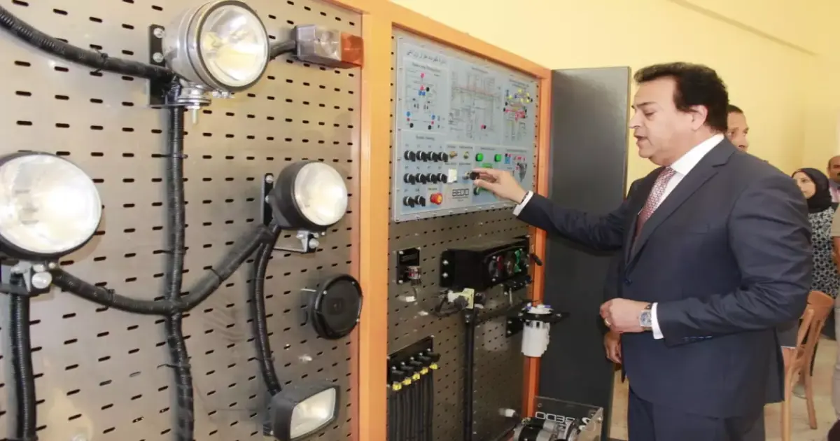 واستمع الوزير إلى شرح تفصيلى عن مكونات الكلية، وما تضمه من نظم تعليمية، وكذا كيفية تشغيل بعض الآلات، منها لوحة المحطة البحثية الخاصة بإدارة المصنع الذكي، والدائرة الكهربائية الخاصة بالسيارات والجرار الزراعي، والنموذج التعليمي لمحرك بنزين.