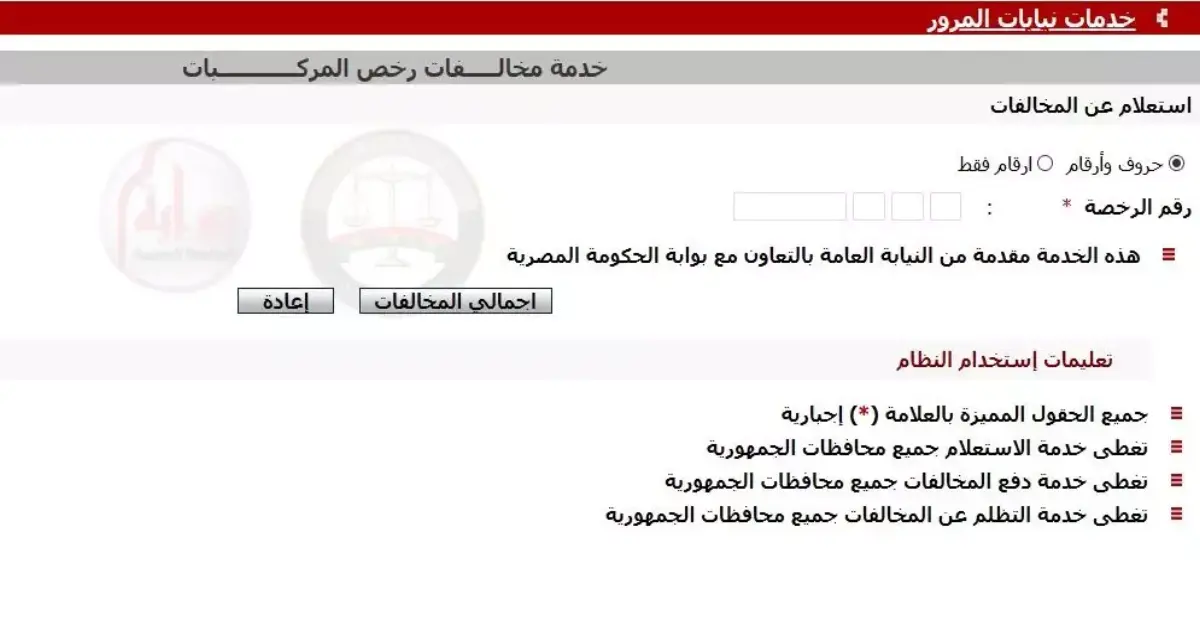 للاستعلام عن مخالفات المرور الخاصة بك يجب الدخول أولا إلى هذا الرابط: http://www.egypt.gov.eg/mobile/services/ntpmoj-gg/functions/PayFines.aspx