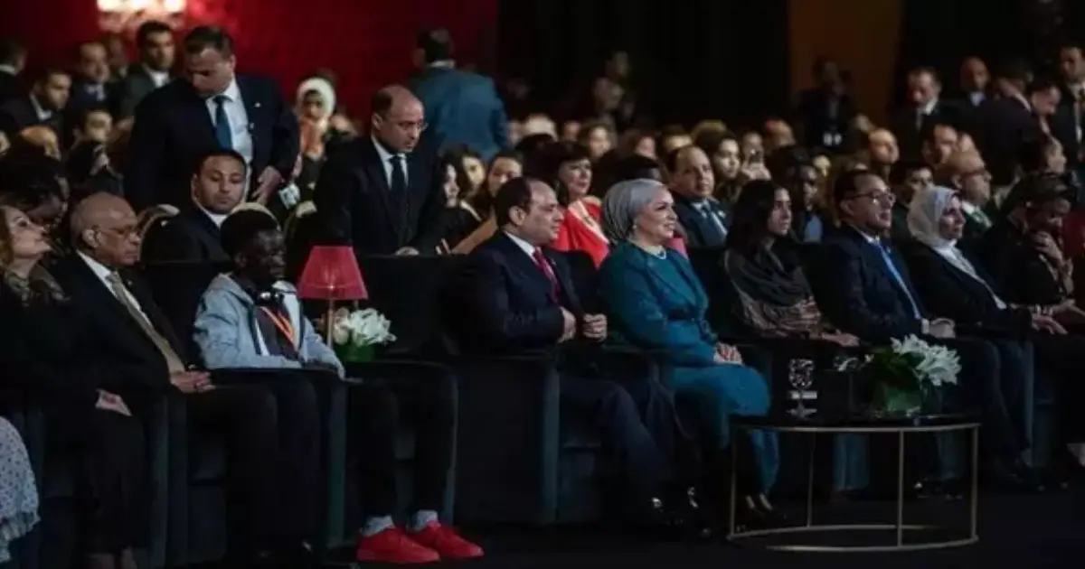 ظهر طالب جنوب السودان صاحب واقعة التنمر بجوار الرئيس عبدالفتاح السيسي، اليوم الجمعة، أثناء حفل مسرح منتدى شباب العالم.