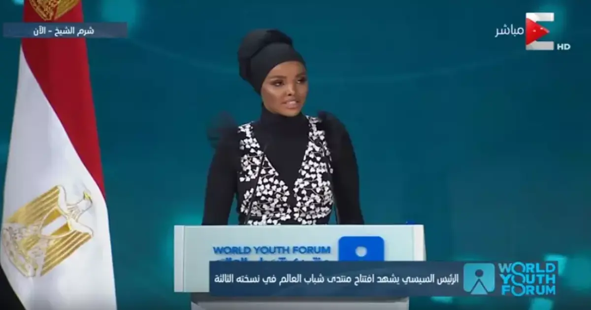 وجهت أول عارضة أزياء محجبة على غلاف مجلات الموضة في العالم، حليمة عدن، مجموعة من النصائح للشباب المشارك بمنتدى شباب العالم قائلا: «اتركوا بصمتكم ولا تستلموا أبدا لليأس ولا تتخلوا عن الأمل، وأخبركم عن شعار حياتي وهو لا تغير نفسك، غير قواعد اللعبة».