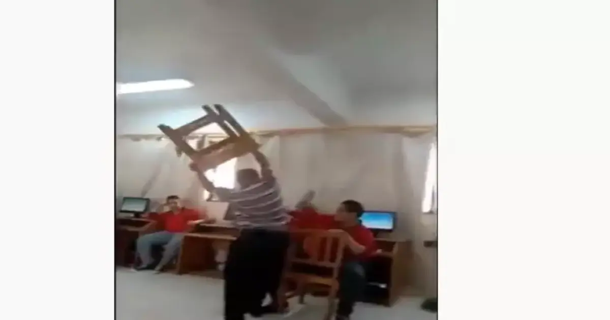 وأنهال بالضرب على طالب داخل فصل صفعًا وركلاً بقدمه وبالعصا حتى سقط على المقعد، دون أن يتدخل أحد لاحتواء الموقف.