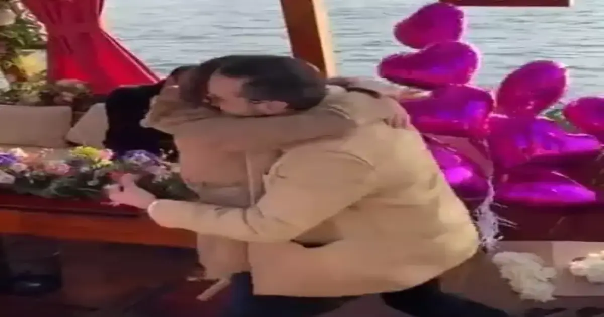 وعلى ألحان أغنية رومانسية للفنان عمرو دياب، فاجأ خطيب شام الذهبي خطيبته بالركوع على قدميه وتقديم علبة خاتم الخطوبة على مرأى ومسمع من الجميع.