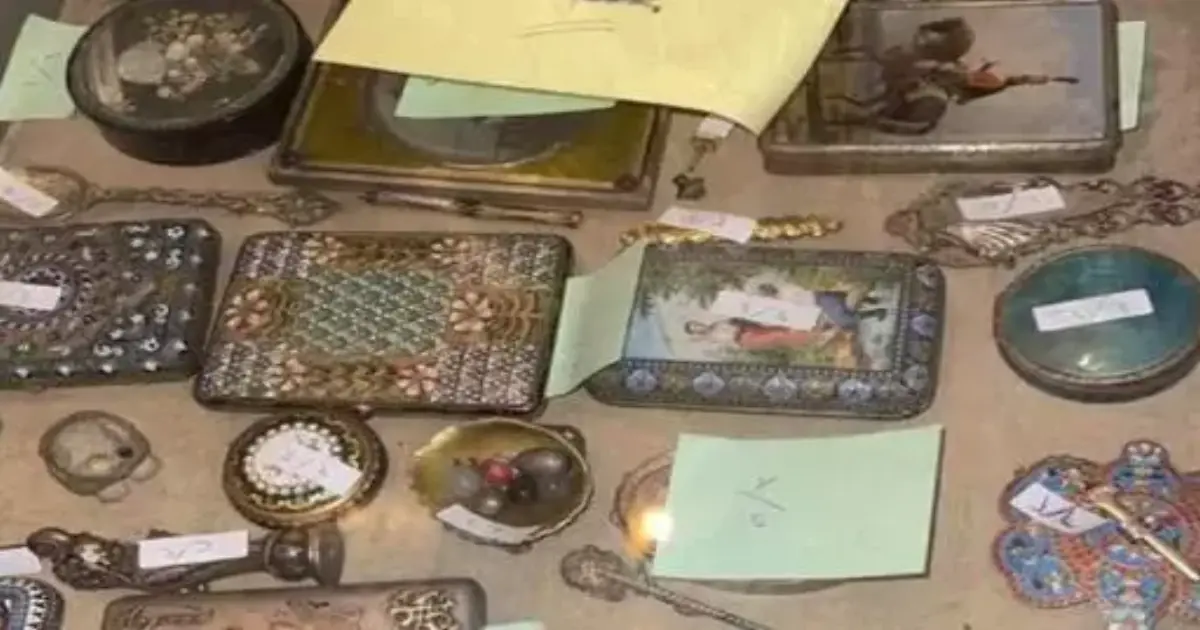 عثرت الأجهزة الأمنية، على أوسمة تاريخية تعود للعصر الملكي، وعدد لا حصر له من المشغولات الذهبية والتحف النادرة، إضافة إلى الأحجار الكريمة التي غطت مساحة الشقة بالكامل.
