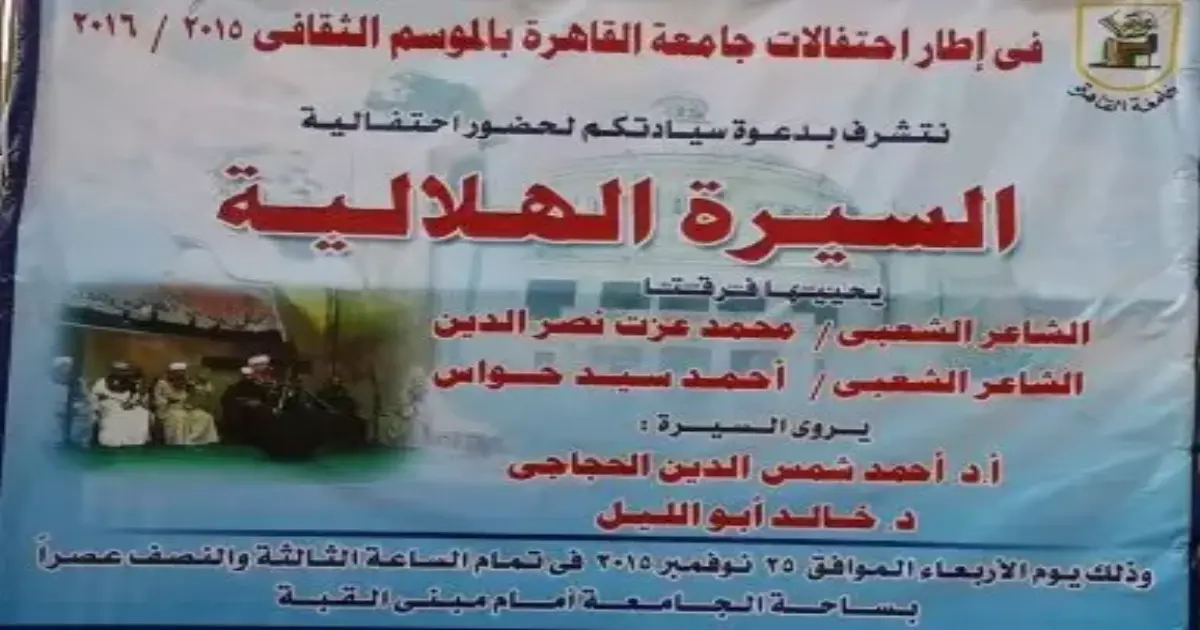 تنظم جامعة القاهرة احتفالية «السيرة الهلالية»، الأربعاء، وذلك في إطار احتفالات الجامعة بالموسم الثقافي 2015/2016.