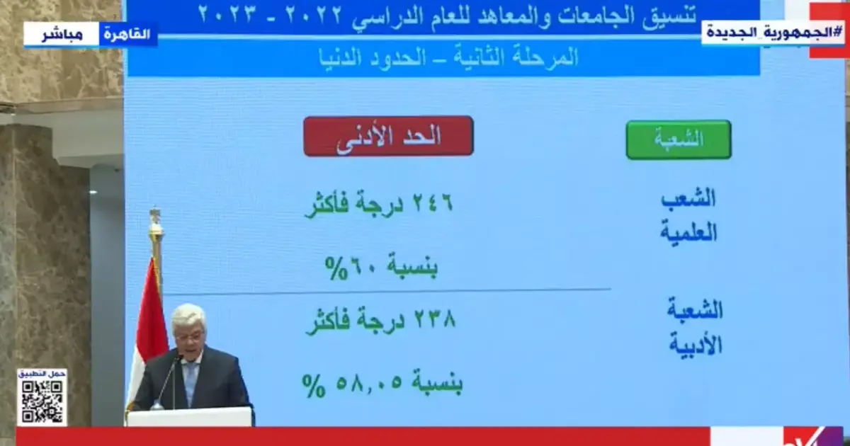 وبدأت المرحلة الأولى لتنسيق الثانوية العامة الخميس 11 أغسطس 2022 بقبول تسجيل طلاب الثانوية العامة من شعبة علمي علوم الحاصلين على 365 درجة فأكثر وطلاب علمي رياضة الحاصلين على 341 درجة فأكثر والمنتسبين للشعبة الأدبية من أصحاب مجموع 264.5 فأكثر.