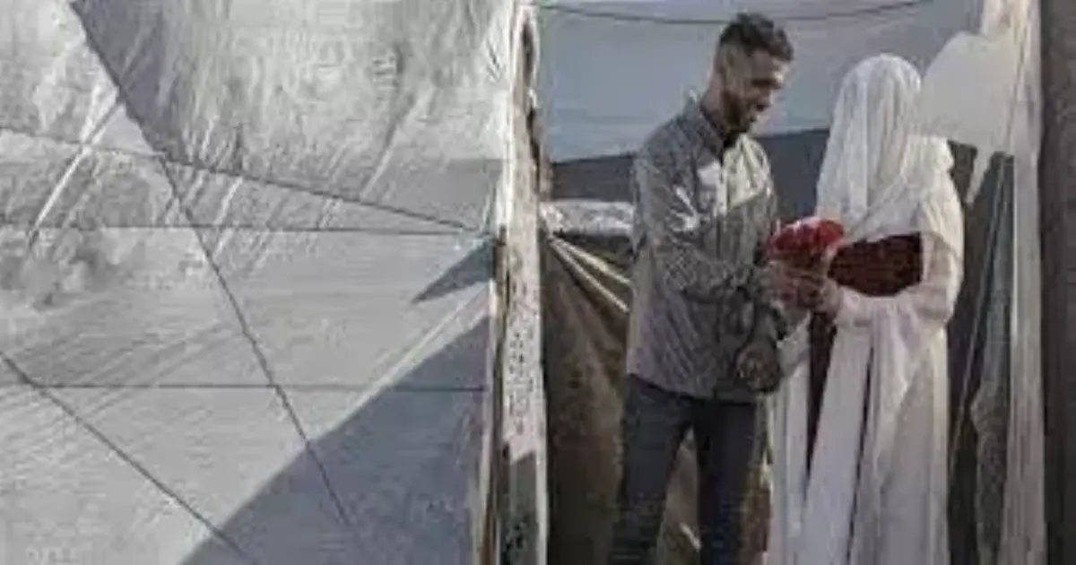 حيث غمرت الفرحة أهالي رفح بزواج اثنين من النازحين وسط الخيام، وهما العروس مريم السيد ديب والعريس عبدالله أبو نخل، وارتفعت أصوات الزغاريط والغناء بين الأهالي.