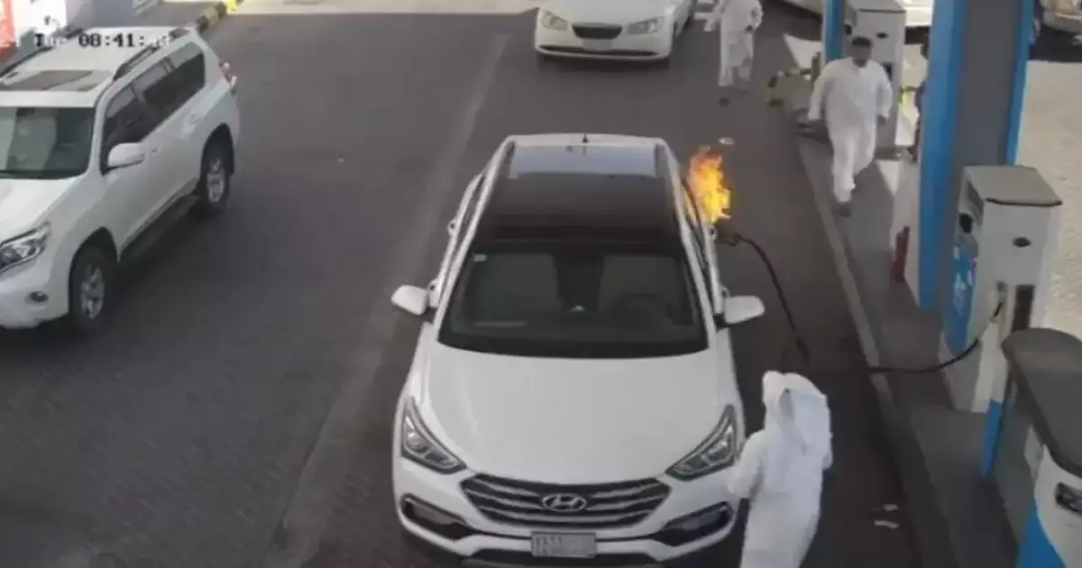بعد ثوان من بدء عملية التزويد بالوقود اشتعل خزان الوقود وبدأت النيران تخرج من الفتحة الخاصة به في الجزء الجانبي للسيارة.