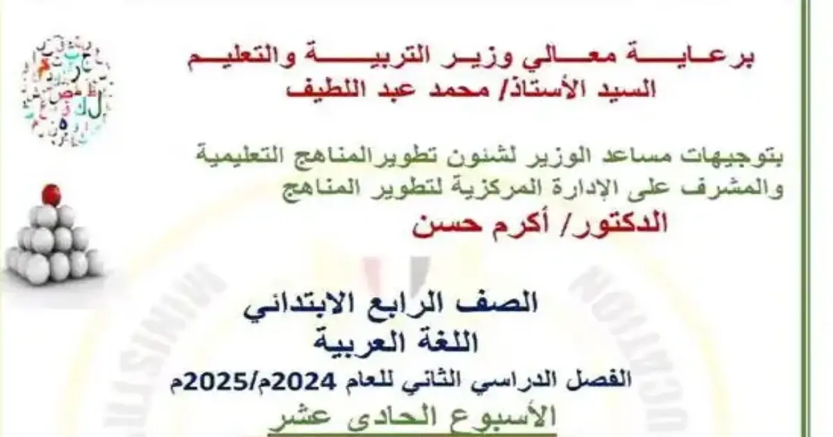 حل التقييم الأسبوعي للصف الرابع الابتدائي عربي الأسبوع الحادي عشر ترم ثاني