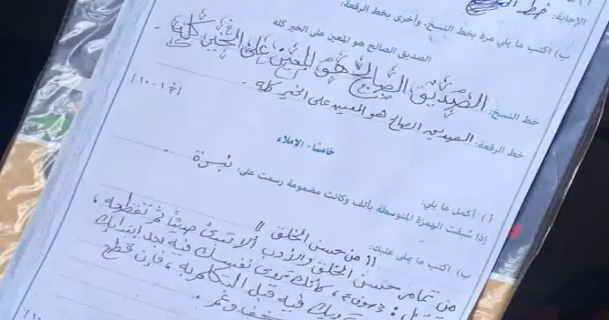 وانتشرت صورة الطالب بينما ورقة امتحانات مادة اللغة العربية والخط والإملاء واضحة، بينما يكتب الطالب بالخط العربي وسواء بالنسخ أو الرقعة، والإملاء، متميزًا بخطه المميز.