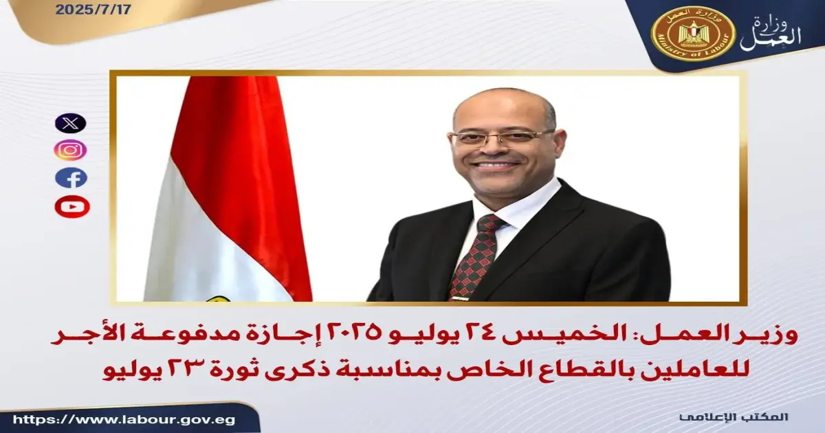 وذكر في البيان الرسمي أن أجازة 23 يوليو 2025 تُعد أجازة مدفوعة الأجر للعاملين الخاضعين لأحكام قانون العمل رقم 12 لسنة 2003، مع احتفاظ صاحب العمل بحق تشغيل العامل خلال هذا اليوم إذا اقتضت الضرورة، وفي هذه الحالة يستحق العامل أجرًا مضاعفًا بالإضافة إلى أجره الأساسي.