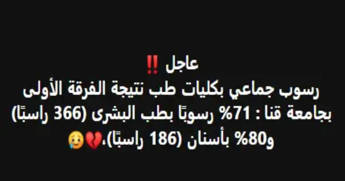أعلنت جامعة قنا الفرقة الأولى لكل من كلية الطب بنسبة رسوب بلغت 71% وكلية أسنان بنسبة 80%، وهو ما فتح بابًا من التساؤلات حول دقة هذه الأرقام، وطبيعة العملية التعليمية داخل الكلية.