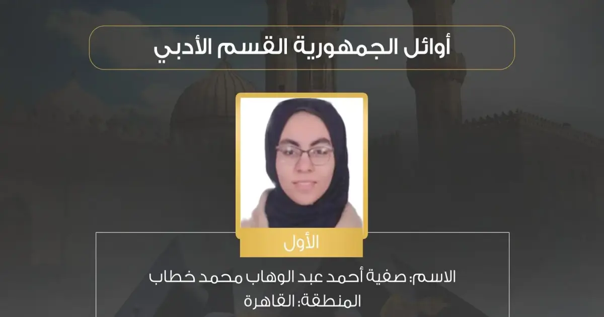 الأول: الطالبة/ صفية أحمد عبد الوهاب محمد خطاب، معهد ف/ الغد المشرق الخاص عربي، منطقة القاهرة، بمجموع ٥٨٣ درجة بنسبة ٩٨.٨%