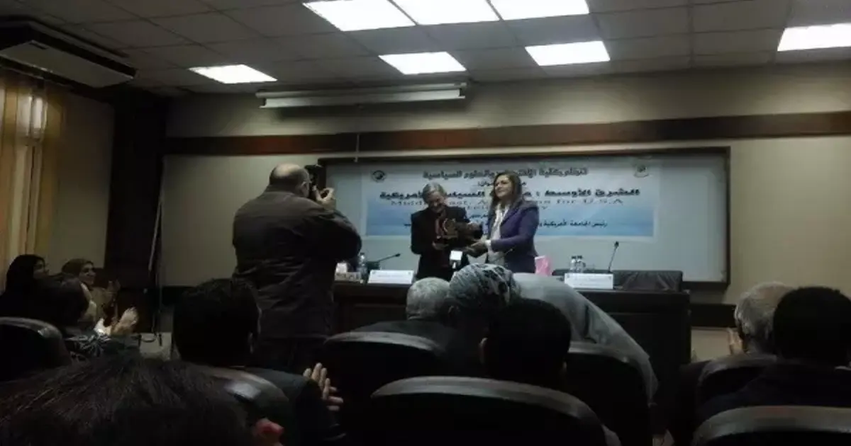 أهدت كلية الاقتصاد والعلوم السياسية درع الكلية لرئيسة الجامعة الأمريكية في مصر والعميد السابق الشئون العامة جامعة كولومبيا، الدكتورة ليزا أندرسون.