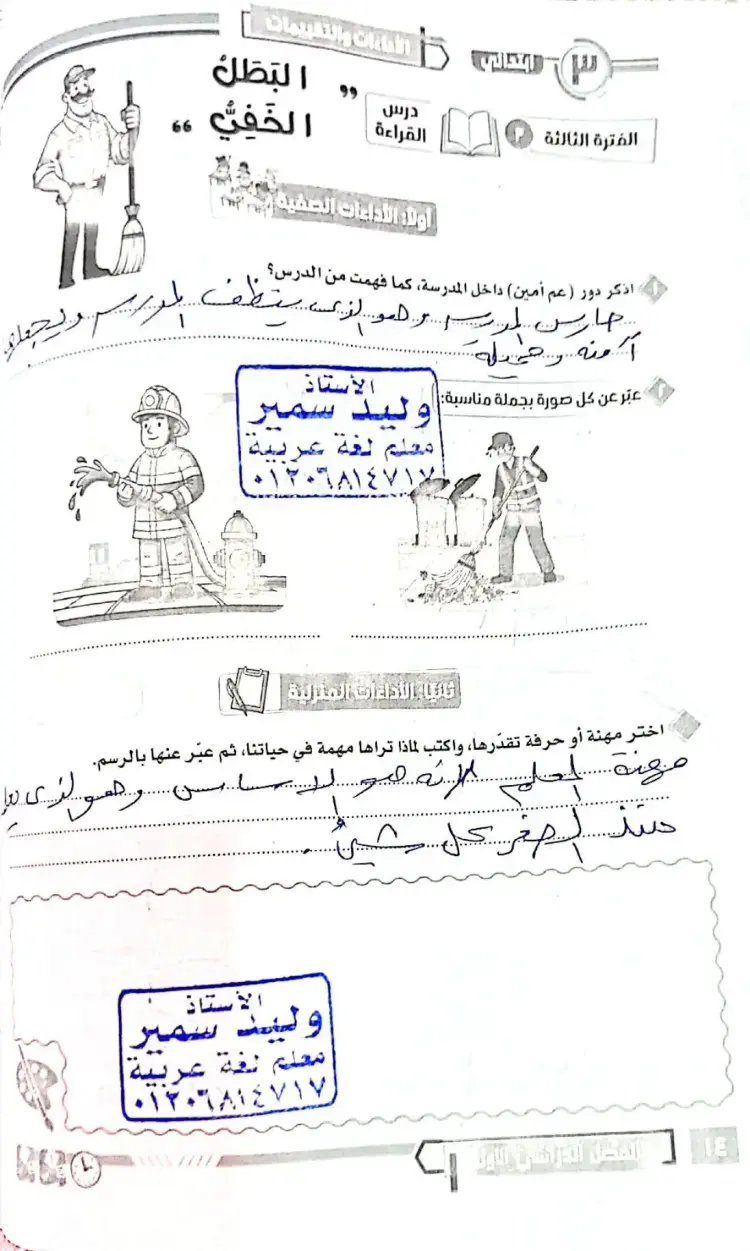 3. السؤال: ماذا يعمل (عم أمين) في المدرسة؟ الإجابة: هو حارس المدرسة.
