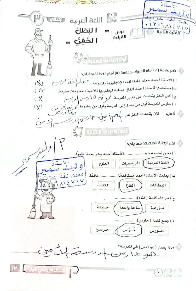 2. السؤال: ضع علامة (✓) أو (✗): الأستاذ أحمد معلم مادة اللغة الإنجليزية بالمدرسة. الإجابة: (✗) خطأ، هو معلم اللغة العربية.