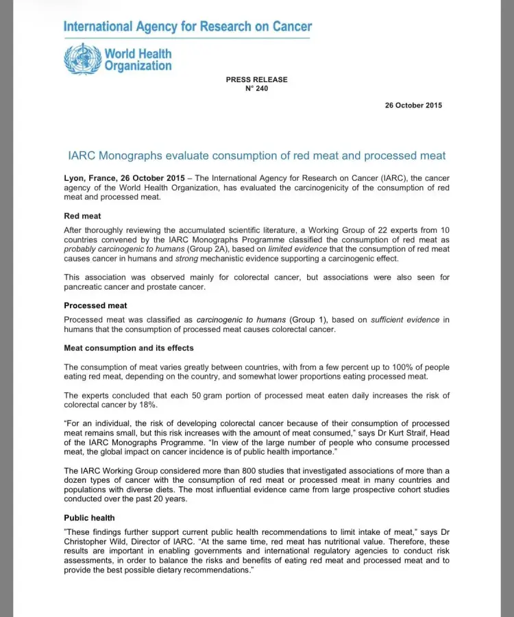 أصدرت الوكالة الدولية لأبحاث السرطان (IARC)، التابعة لمنظمة الصحة العالمية، تقريرًا مفصلاً بشأن اللحوم الحمراء والمصنعة، تضمن النقاط التالية: