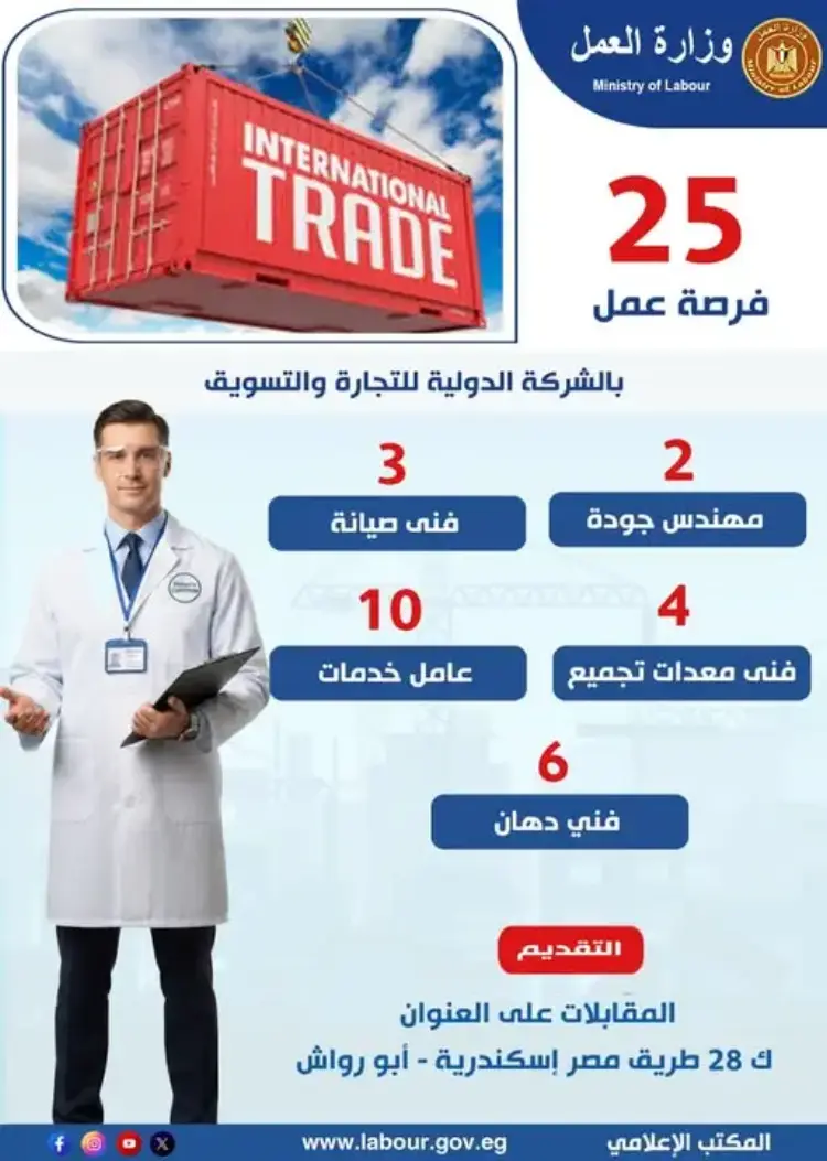 أعلنت وزارة العمل اليوم الخميس الموافق 2 أكتوبر 2025، عن توفر وظائف جديدة للشباب من خلال طرح 25 فرصة عمل في الشركة الدولية للتجارة والتسويق.