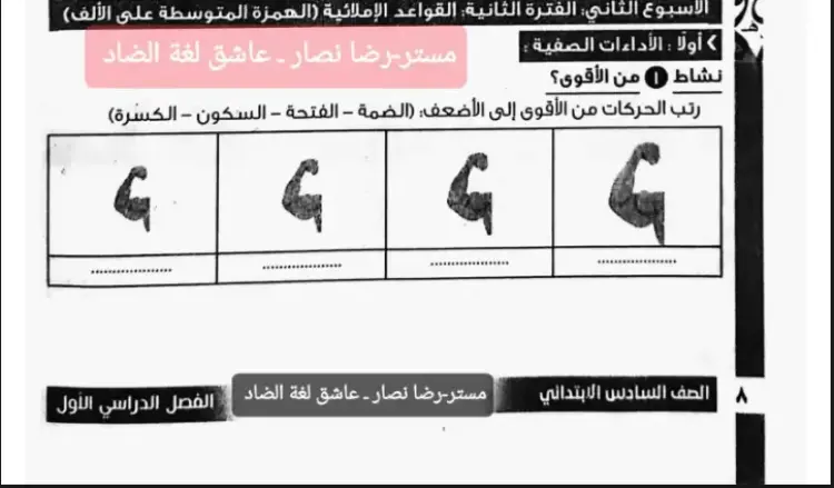 السؤال: رتّب الحركات من الأقوى إلى الأضعف: (الضمة - الفتحة - السكون - الكسرة).