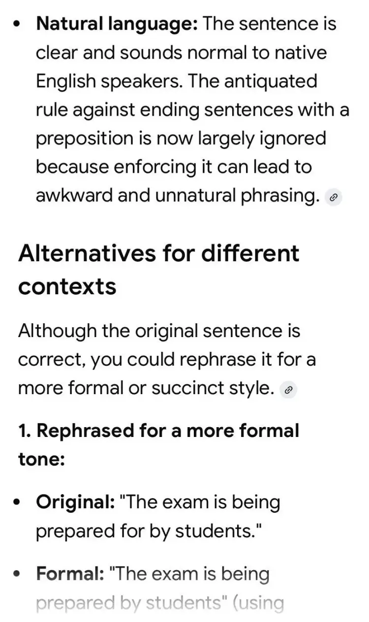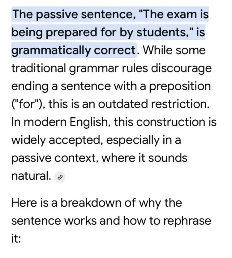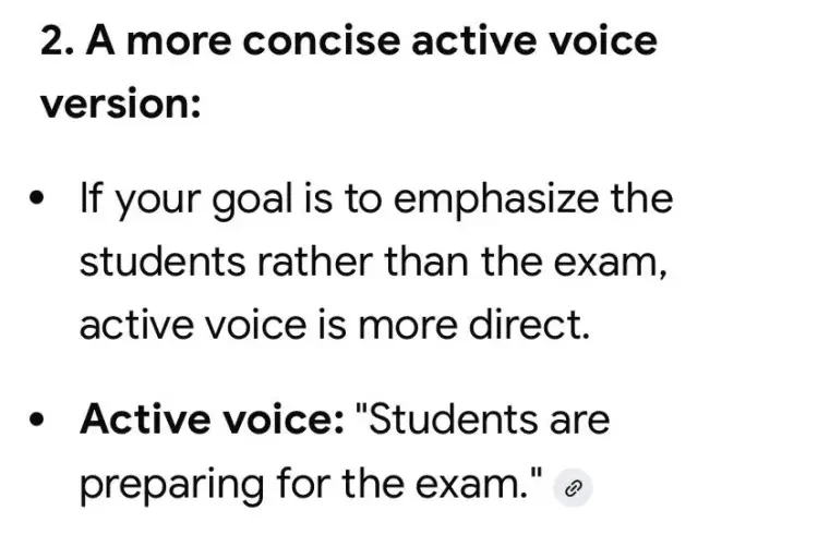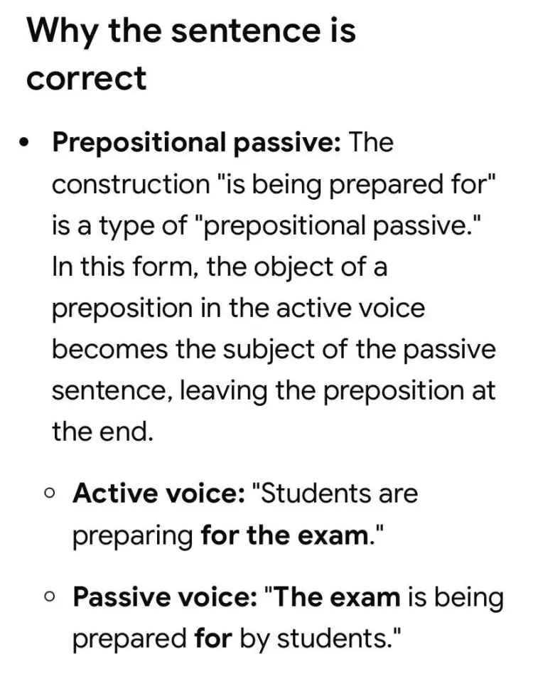 السؤال: Rewrite the sentence: The students are preparing for the exam now. (using "prepared") الإجابة: The exam is being prepared for by the students now.