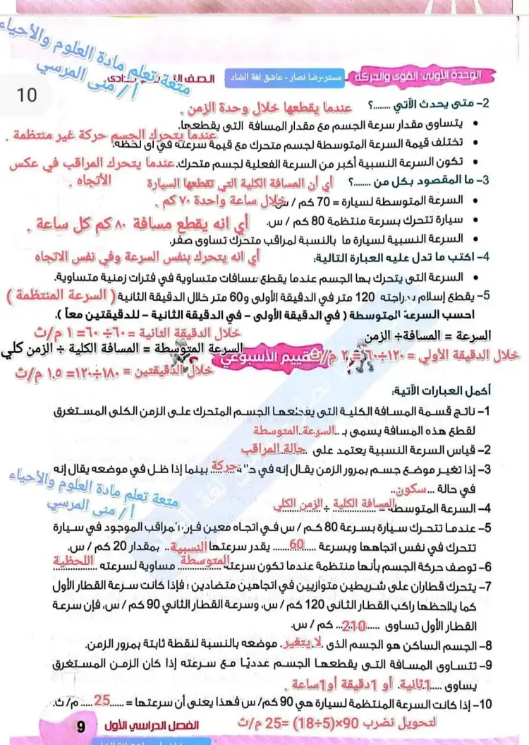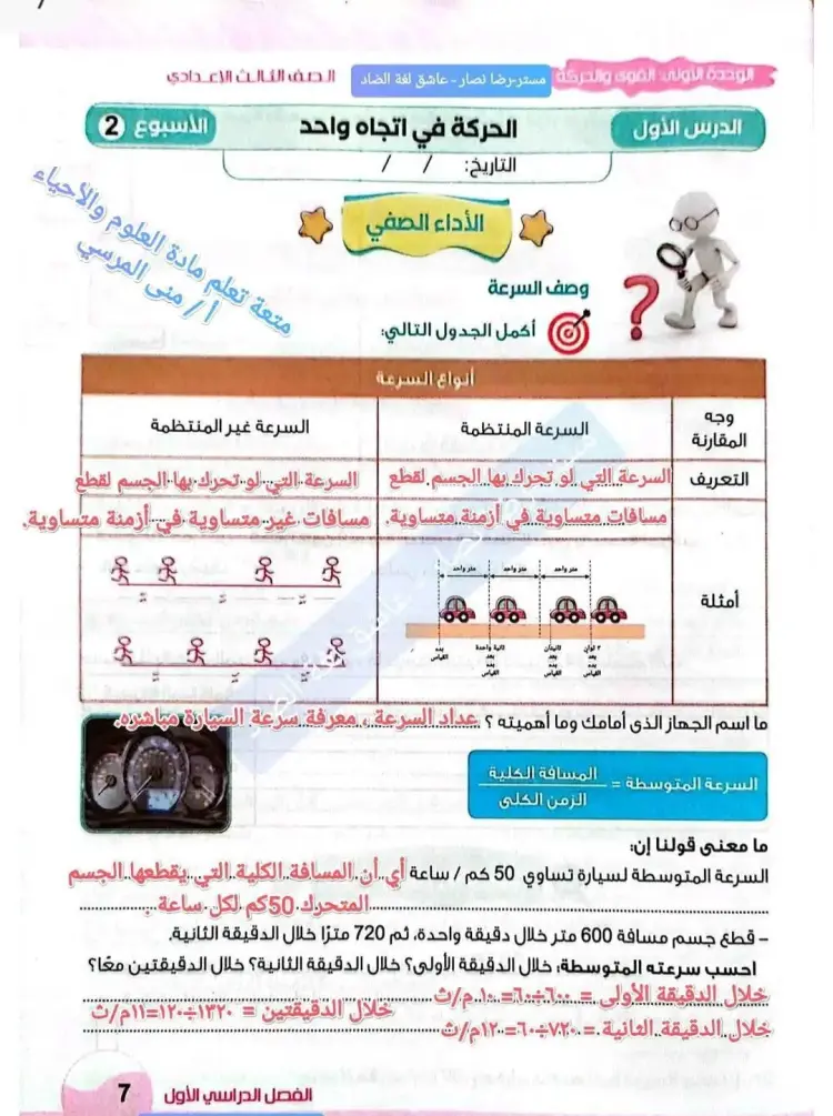 • السرعة المتوسطة لجسم متحرك تساوي المسافة الكلية ÷ الزمن الكلي.