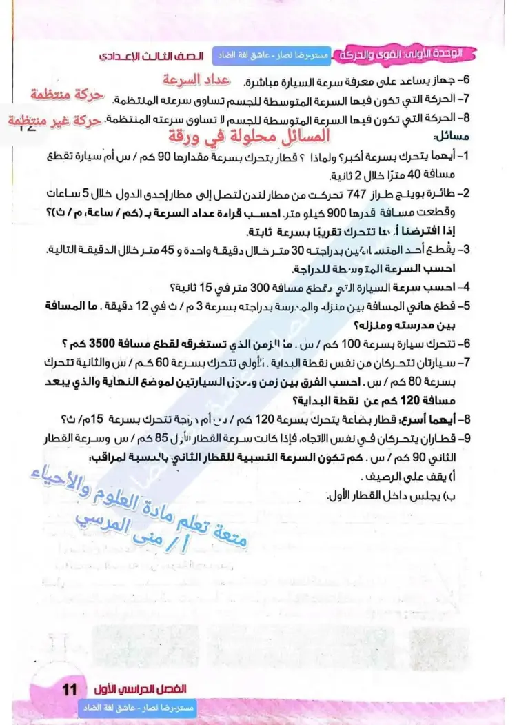 • إذا كانت السرعة المنتظمة لسيارة هي 90 كم/س فهذا يعني أن سرعتها تساوي 25 م/ث.